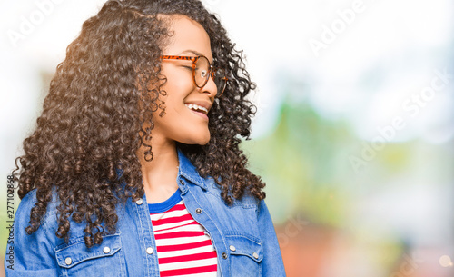 Young Beautiful Woman Curly Hair Wearing Glasses Looking Side